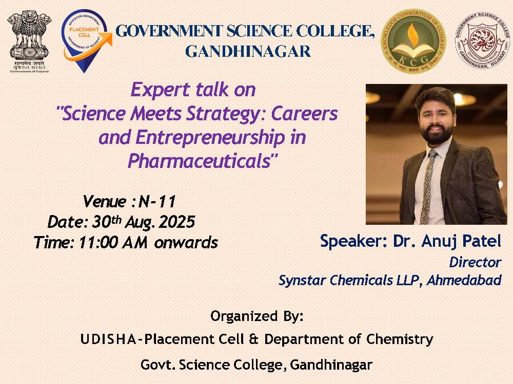 A very warm Greetings to all! With immense pleasure and gratitude, I take this opportunity to pen down a few lines for my college. Government Science College, Gandhinagar is situated in a beautiful and picturesque location in the clean and green capital city of Gujarat. Placed in an eco-friendly campus, the college is home to a well-diversified flora and fauna. The college provides education leading to Under Graduate Degree in the discipline of science. With a well-qualified team of dedicated and passionate faculty members, we foster critical thinking, creativity and problem-solving skills among our students. The nine gold medals that our institute has secured in the past five years is testimonial towards the meticulousness that our faculty and students have put forth in the field of education.